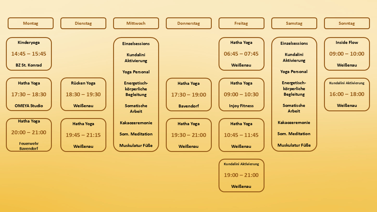 Die Stunde setzt sich zusammen aus der Aktivierung des Vagusnervs, Meditationen, Atem-, Entspannungs-und Körperübungen, zudem noch Wissen über Stress. Ziel des Kurses ist es dir ein Handwerkzeug mitzugeben um Stresssituationen frühzeitig zu erkennen und achtsam und bewusst damit umzugehen und dir im Alltag Entspannungsoasen einzubauen, die deinen Vagusnerv aktivieren. Zudem werden Verspannungen sanft gelöst und dein Körper mobilisiert.